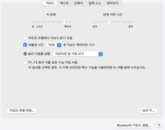 Study/시행착오 [해결] 기계식 키보드 맥 셋팅 - 728x90 안녕하세요, 럼지입니다. 이번에 로우파일 키보드를 샀는데 맥 전용이 아니어서 키보드 셋팅을 하느라 좀 애먹었는데요. 캡쳐와 같이 좌상단의 애플 로고 - 시스템 환결 설정 - 키보드 - (우하단) 보조 키 메뉴에서 사진과 같이 설정하면 맥 기본 키 설정과 동일하게 사용하실 수 있습니다. 저처럼 예쁜 거 , 혹은 색감 하나 보고 키보드 구입하시는 분들을 위해 기록해보는 설정이었습니다 (๑・◡・๑) 728x90 공유하기 게시글 관리 TalkativeResearch Engineer 저작자표시 비영리 변경금지 (새창열림) 'Study > 시행착오' 카테고리의 다른 글 [해결] iterm2 conda 환경 이름표시 방식 바꾸기 (0) 2025.07.09 [해결] pyspark로 mongoDB에서 데이터 불러오기 (0) 2025.02.10 [해결] ImportError: cannot import name 'NDArray' from 'numpy.typing' (0) 2024.04.24 [해결] Watchdog caught collective operation timeout, Multi-GPU (DDP) NCCL 타임아웃 시간 설정 (0) 2023.06.23 [ongoing] 깃허브 키체인 항목 접근 권한 변경에 대한 암호 입력 (1) 2023.05.08 Contents 당신이 좋아할만한 콘텐츠 [해결] iterm2 conda 환경 이름표시 방식 바꾸기 2025.07.09 [해결] pyspark로 mongoDB에서 데이터 불러오기 2025.02.10 [해결] ImportError: cannot import name 'NDArray' from 'numpy.typing' 2024.04.24 [해결] Watchdog caught collective operation timeout, Multi-GPU (DDP) NCCL 타임아웃 시간 설정 2023.06.23 댓글 0 + 이전 댓글 더보기