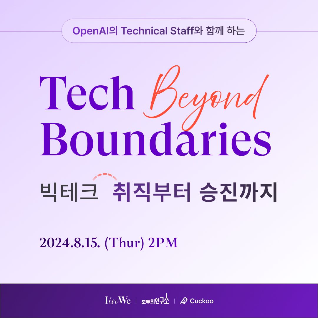 광복절일 뿐만 아니라 여름 시즌의 귀한 공휴일이라서 더 기쁜 15일 오후에 아이인위 오프라인 첫 행사, "Tech beyond Boundaries: 빅테크 취직부터 승진까지"에 가봤어요. 모두의연구소 캠퍼스 방문은 처음이었는데 시설이 굉장히 깔끔하고 좋았습니다. OpenAI에서 Technical staff로 일하고 있는 Adrian의 강연이 메인이었는데, 취직뿐만 아니라 이직에도 적용할 수 있는 요소들과 내가 지금 이 회사에서 어떤 발전을 해나가면 좋을지 생각해 보게 된 시간이었습니다.