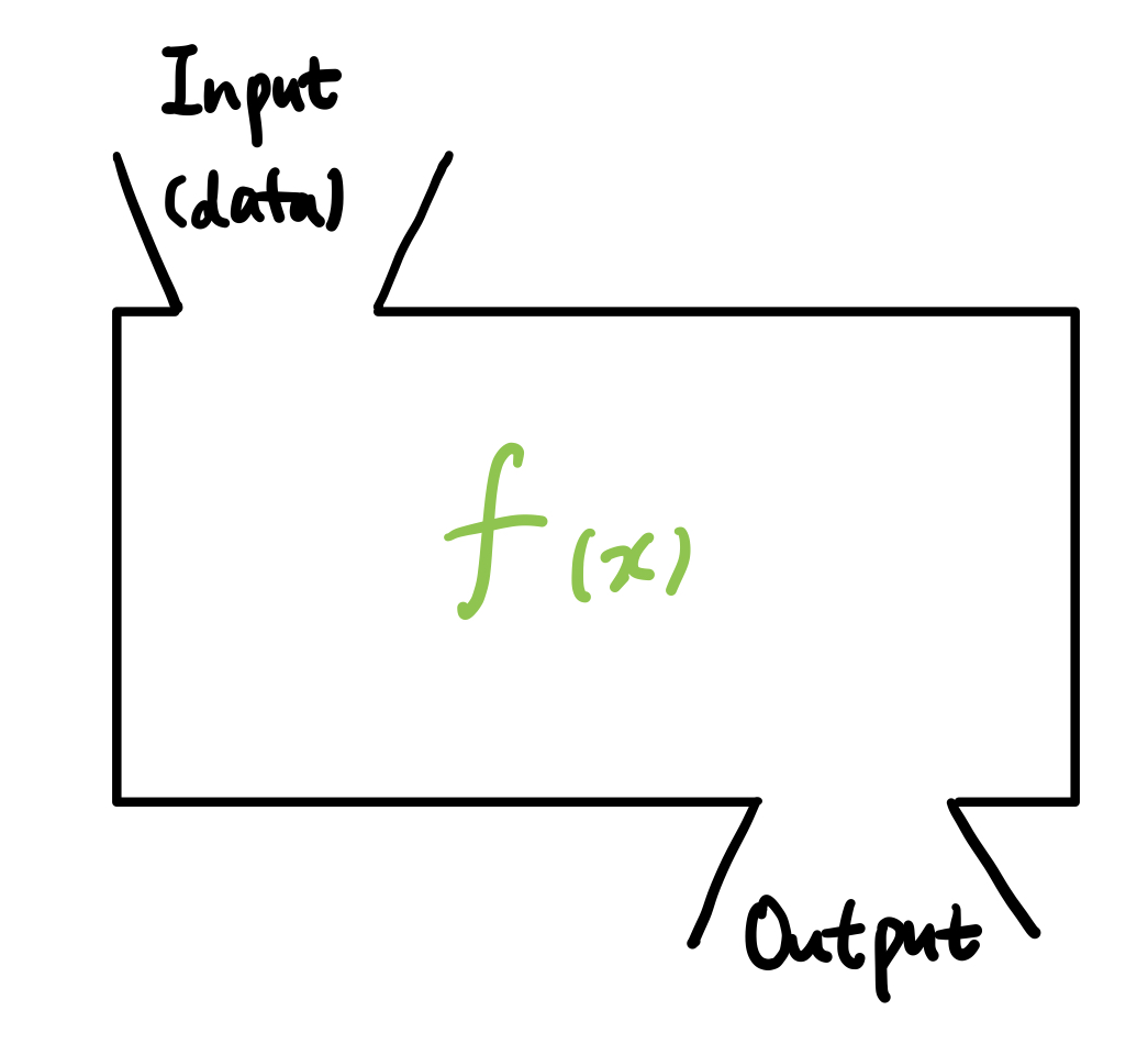 인공지능이 '주어진 데이터 (input)'를 학습하여 목표(output) 를 성취하기 위해 수행해야 하는 행동 (그림에서의 $f(x)$ = 함수, 알고리즘 등)을 말합니다. 가장 기본적인 모델로는 선형 회귀에서의 $ ax+b $ 를 예로 들 수 있습니다.