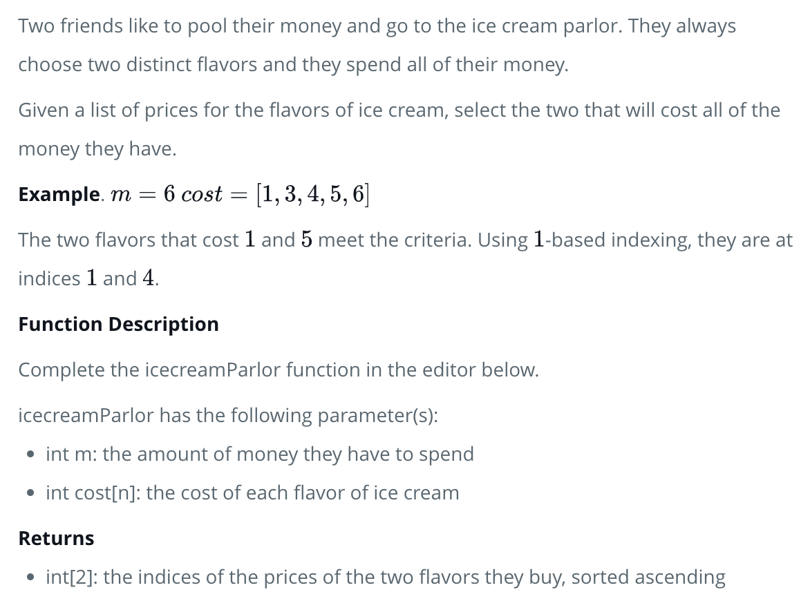 Study/문제풀이 [hackerrank] Ice Cream Parlor (Python) - 728x90 문제 (링크) 아이스크림 가게에 간 두 친구, 출금한 돈에 딱 맞게 두 개의 아이스크림을 사려고 함 쓸 수 있는 돈과 각 아이스크림의 가격이 담긴 리스트가 주어짐 가격표의 index는 1부터 시작! 가격에 맞게 살 수 있는 아이스크림 가격의 index를 return 파이썬 풀이 def icecreamParlor(m, arr): # Write your code here pick = [] for i, v in enumerate(arr[:-1]): for j, w in enumerate(arr[i+1:]): if v+w == m: pick.extend([i+1, i+j+2]) return pick 굳이 가격표를 처음부터 순회할 필요가 없다~ 728x90 공유하기 게시글 관리 TalkativeResearch Engineer 저작자표시 비영리 변경금지 (새창열림) 'Study > 문제풀이' 카테고리의 다른 글 [hackerrank] Binary Search Tree : Lowest Common Ancestor (Python) (0) 2023.08.16 [hackerrank] balanced brackets (Python) (0) 2023.06.27 [hackerrank] Sherlock and the Valid String (Python) (1) 2023.06.21 [hackerrank] Tower Breakers (python) (0) 2023.06.18 [leetcode] 리트코드 706번 해시맵 디자인 (1) 2023.02.01 Contents 당신이 좋아할만한 콘텐츠 [hackerrank] Binary Search Tree : Lowest Common Ancestor (Python) 2023.08.16 [hackerrank] balanced brackets (Python) 2023.06.27 [hackerrank] Sherlock and the Valid String (Python) 2023.06.21 [hackerrank] Tower Breakers (python) 2023.06.18 댓글 0 + 이전 댓글 더보기