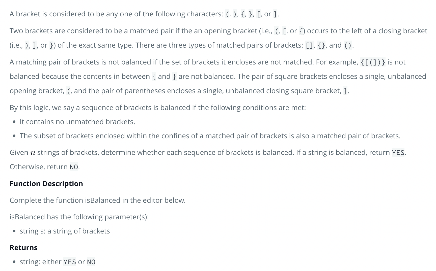 balanced bracket이란? 짝이 없는 괄호가 없고, 괄호의 부분집합이 짝이 맞는 괄호안에 들어가있어야 한다
